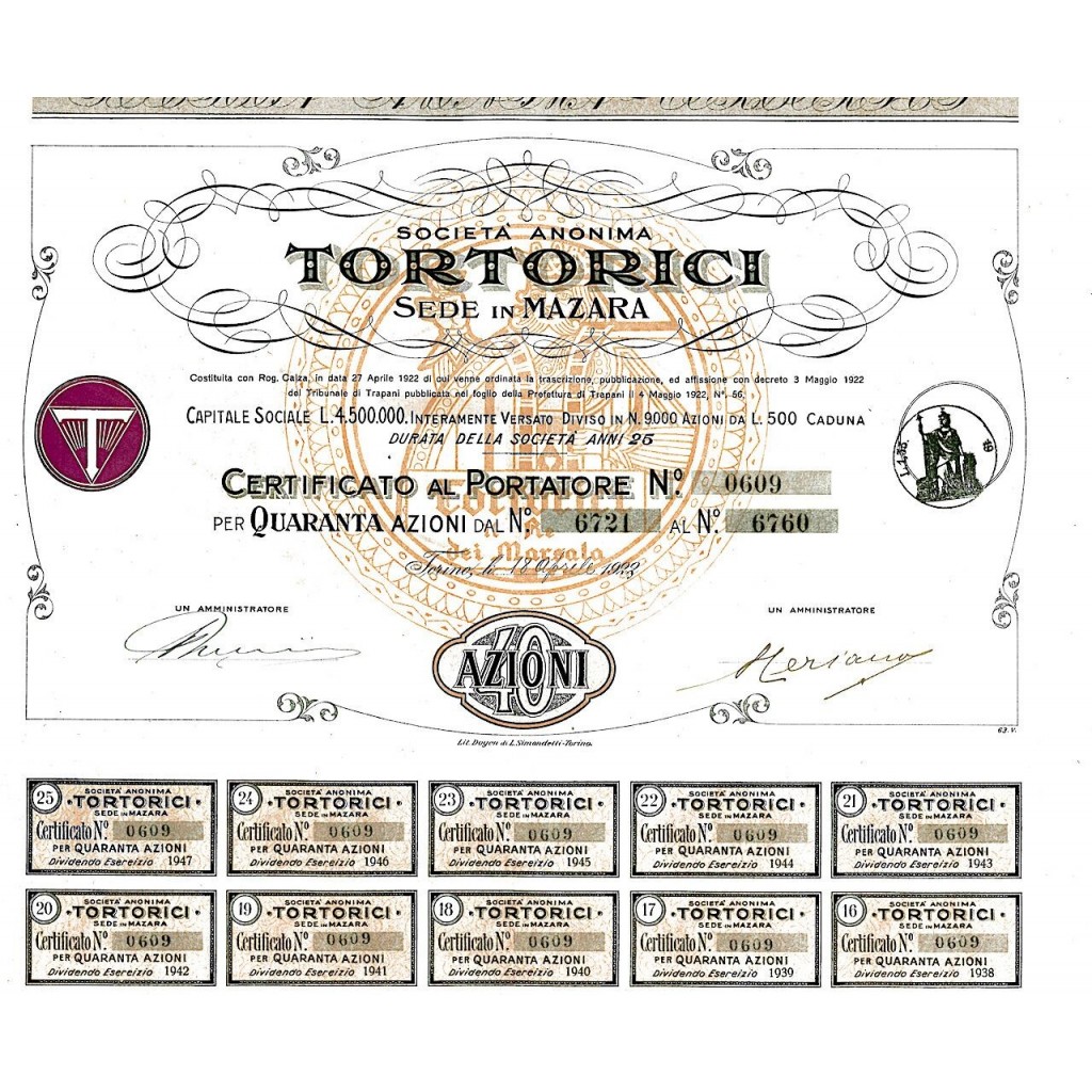C-50326Tortorici S.A. – sede a Mazara del Vallo-3Torino192240 azioni di fondazione al portatore da Lire 500R3 (501-1000 pezzi)S4 (da 101 a 250 €)