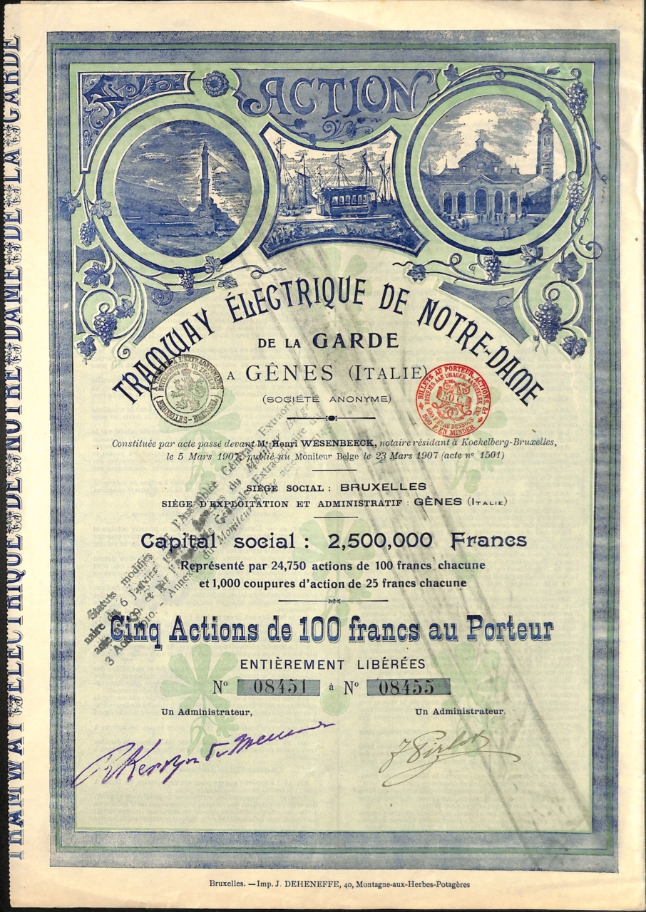 Il titolo si riferisce alla società Tramway Electrique de Notre-Dame de la Garde a Gênes, società belga sorta nel 1907 per un progetto di tramway elettrico che servisse il Santuario della Madonna della Guardia di Genova (Genes in francese). La Società in questione non realizzò mai l’opera per problemi tecnici ed economici. Nel 1924 nacque la S.A. Ferrovia Santuario della Guardia Genova – S.Quirico, che realizzò un’autoguidovia che utilizzava la trazione su gomma combinandola alla guida su rotaia. Il servizio cessò negli anni Sessanta, soppiantato dai più economici autobus.