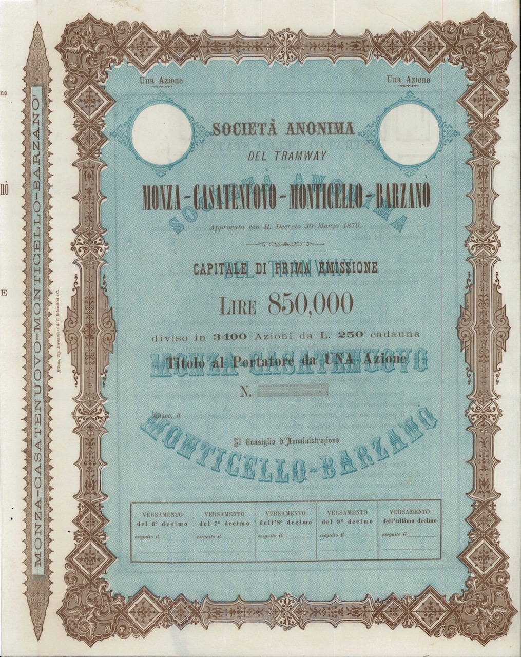 A-10009Tramway Monza-Casatenuovo-Monticello-Barzano S.A. del-1Tip. Bernardoni di C. Rebeschini & C.Milano18791 azioneR6 (51-100 pezzi)S4 (da 101 a 250 €)