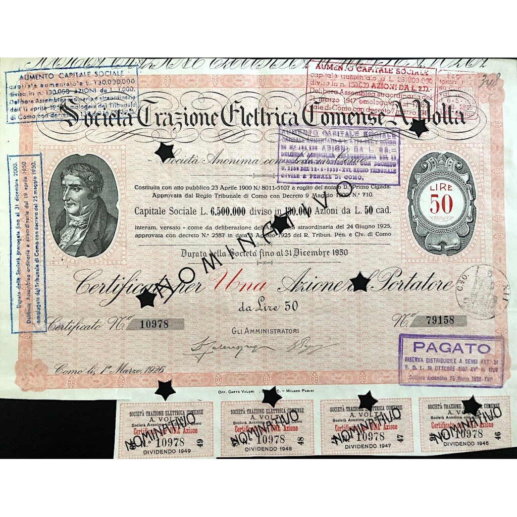 B-50462Trazione Elettrica Comense A. Volta S.A.-2Como19261 azione al portatore da Lire 50R2 (1001-5000 pezzi)S3 (da 51 a 100 €)