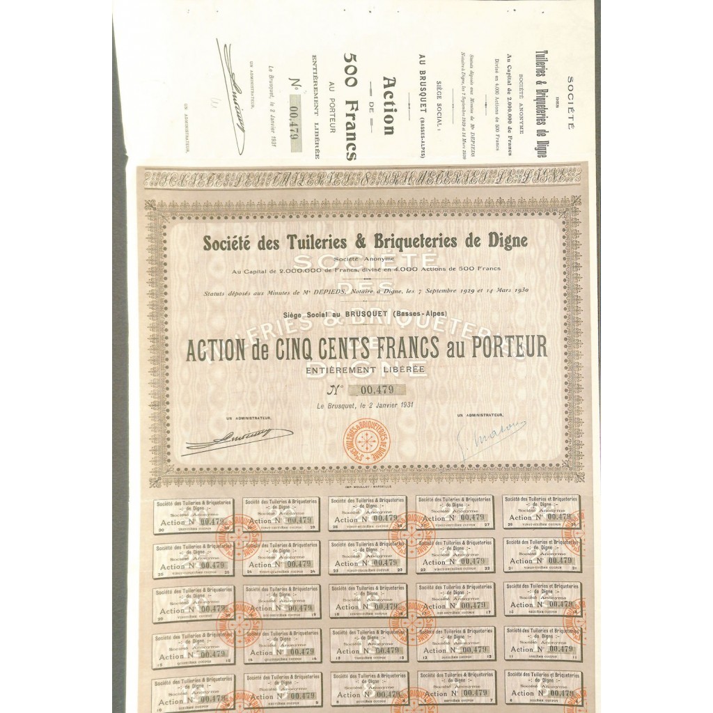 B-51952Tuileries et briqueteries de digne soc. Des-2 Le Brusquet1931Parte di fondazione al portatore.R1 (Più di 5000 pezzi)S1 (da 0 a 25 €)