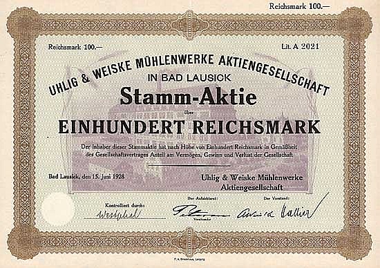 A-68375Uhlig & Weiske Mühlenwerke AG-1Bad Lausick19281 azione da 100 Marchi--