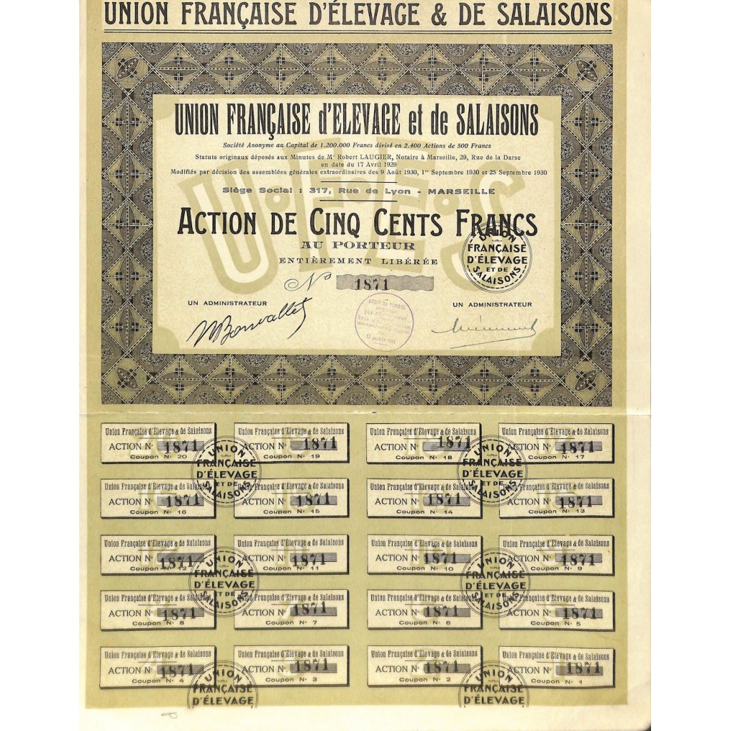 A-51857Union francaise d’elevage et de salaisons-1 Marsiglia1930500 FranchiR1 (Più di 5000 pezzi)S1 (da 0 a 25 €)
