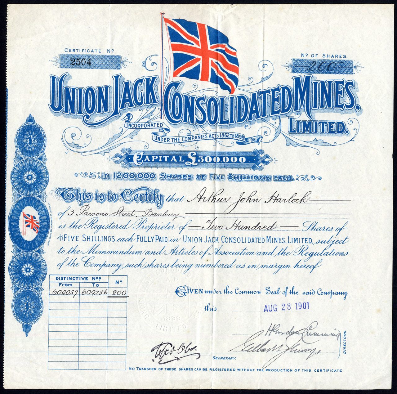 Registrato nel 1899 per acquisire la miniera di Union Jack a Charters Towers, nel Queensland. Ha inoltre acquisito Golden Gate Mining Co., Sunburst Gold Mining Co., Lady Carrington Gold Mine e John Bull Gold Mine. Dissolto <1916. Numero società 63714