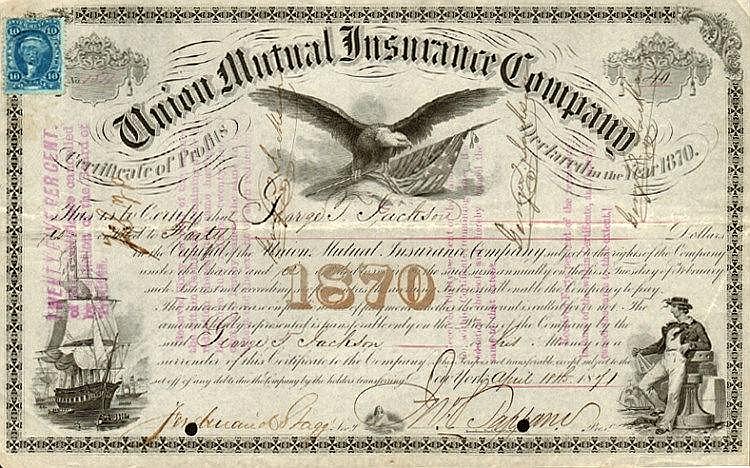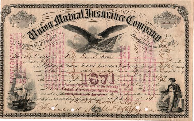 Quota nominativa di godimento (certificate of profits) di 50 $ con diritto di partecipare agli utili in ragione del 6%. New York 20 novembre 1874. Pregevole carta fine. 27,5x17,5 cm. Vignette: aquila ad ali spiegate che regge il vessillo statunitense, veliero in navigazione e marinaio in divisa con un sestante. La compagnia, specializzata nel ramo vita, fu fondata nel 1871.