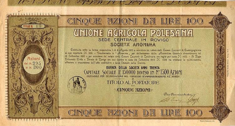 C-7164Unione Agricola Polesana-3Tipografia sociale editrice – RovigoRovigo19145 azioni da lire 100R4 (251-500 pezzi)S4 (da 101 a 250 €)
