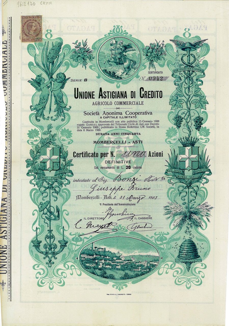 Certificato nominativo per una azione definitive del valore di Lire 20 cadauna. Emesso a Mombercelli – Asti il 31 marzo 1903. La società costituita in Mombercelli con atto pubblico 15 gennaio 1900 rogato Garelli, approvata dal Tribunale Civile di Asti con Decreto 31 Gennaio 1900. Preziosa grafica con cornici che presentano i relativi stemmi del Comunue di Mombercelli sulla sinistra con la scritta (HOSPES HOSTIS VENIAT FUGIAT) e sulla destra lo stemma di Asti con la scritta (ASTE NITET CUSTODE SECUNDO MUNDO SANCTO). In basso al centro immagini della città e in alto. In alto l’immagine di uomo a cavallo con bandiera.