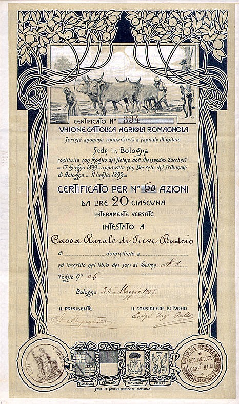Nel campo superiore vignetta di sapore agreste con contadini intenti all'aratura con i buoi; in quello inferiore spiccano gli stemmi araldici delle quattro legazioni: Bologna, Ferrara, Ravenna e Forlì.
