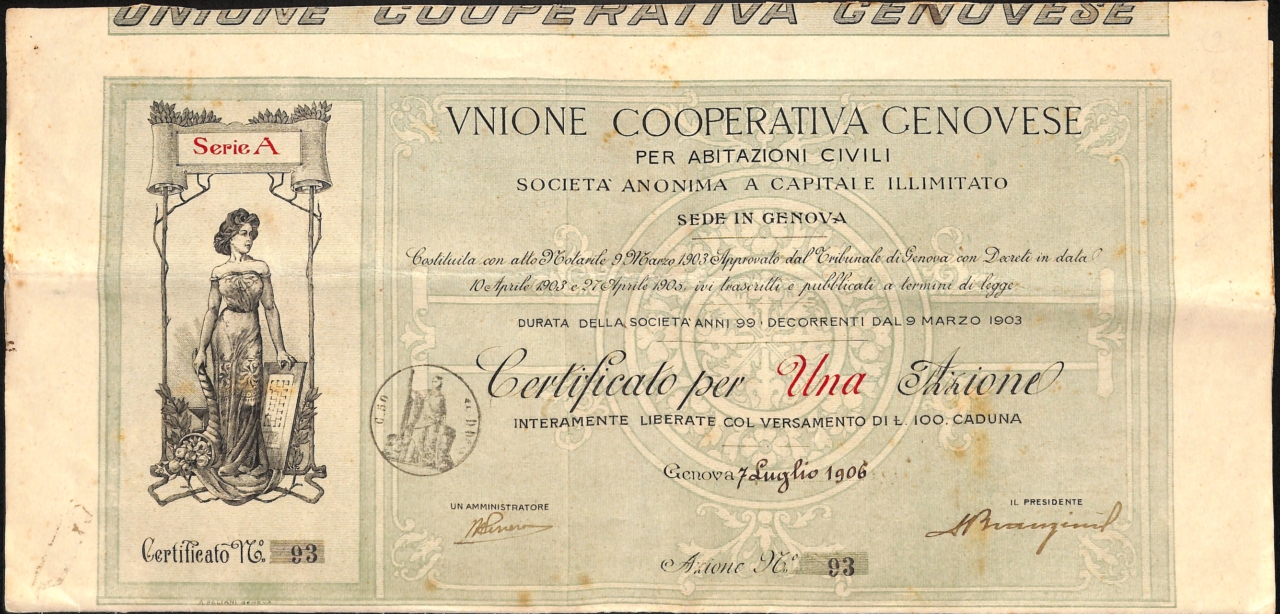 A-10766Unione Cooperativa Genovese per Abitazioni Civili-1A. BalianiGenova19061 azione di fondazione nominativa da Lire 100R2 (1001-5000 pezzi)S2 (da 26 a 50 €)
