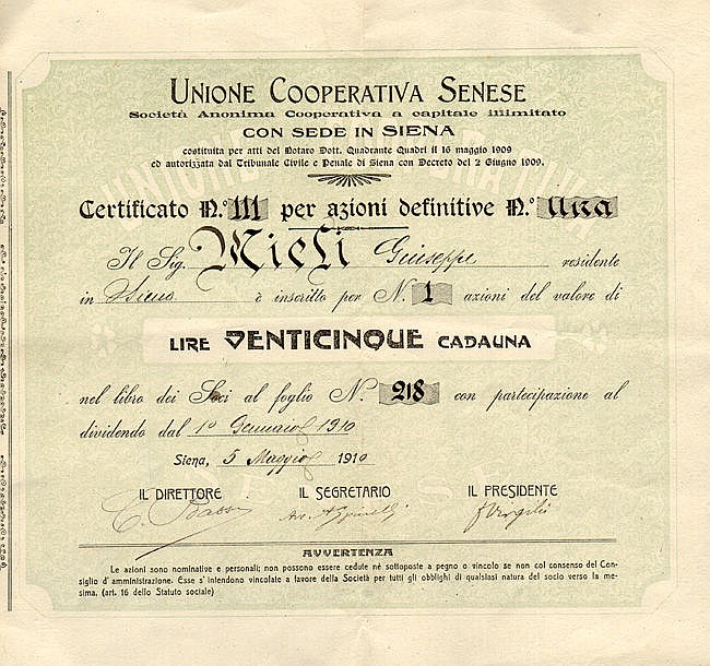 A-50583Unione Cooperativa Senese S.A.-1Siena19101 azione nominativa cumulativa da Lire 25R2 (1001-5000 pezzi)S3 (da 51 a 100 €)
