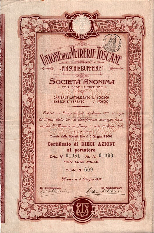 A-53941Unione delle Vetrerie Toscane (Fiaschi e Bufferie)-1Firenze190710 azioni di fondazione al portatore da 100 LireR4 (251-500 pezzi)S3 (da 51 a 100 €)
