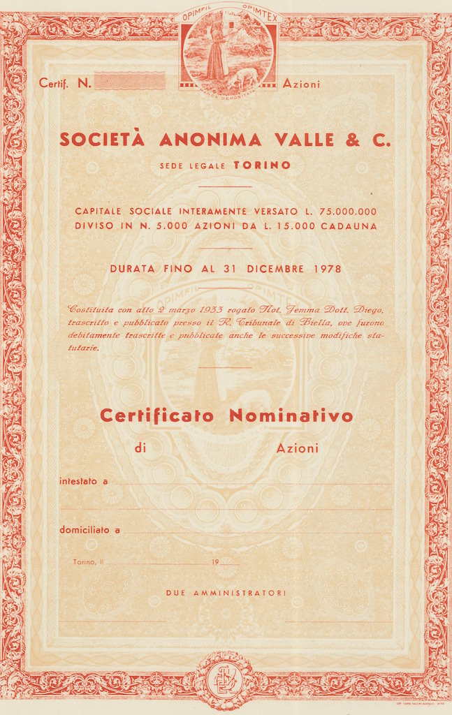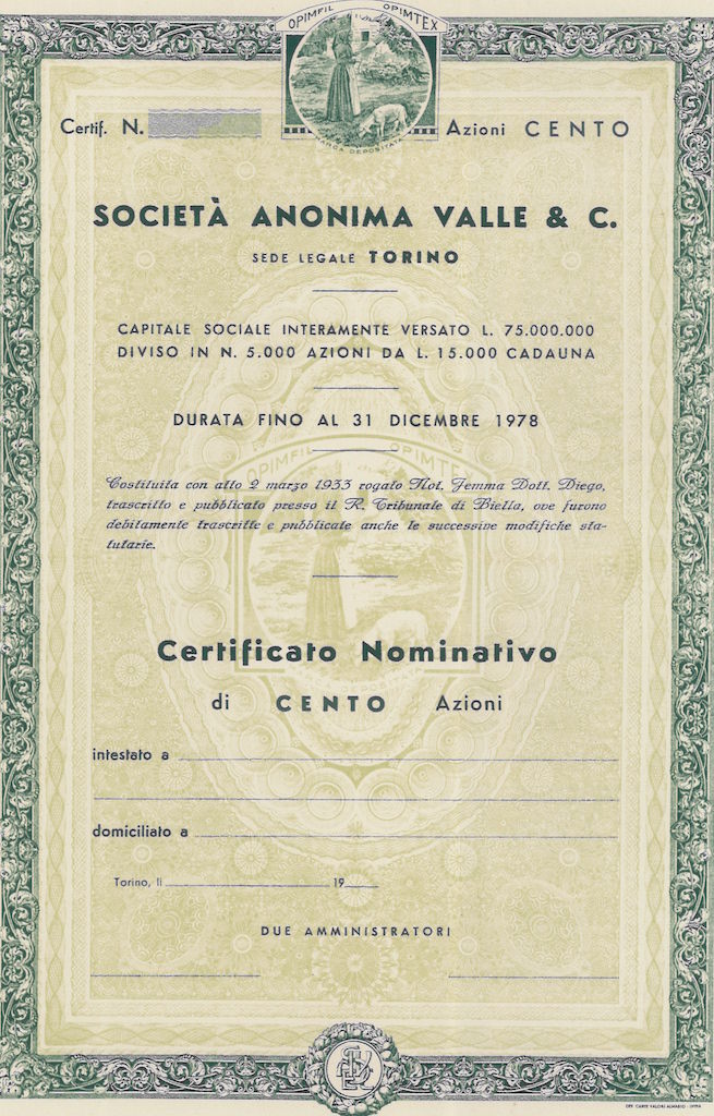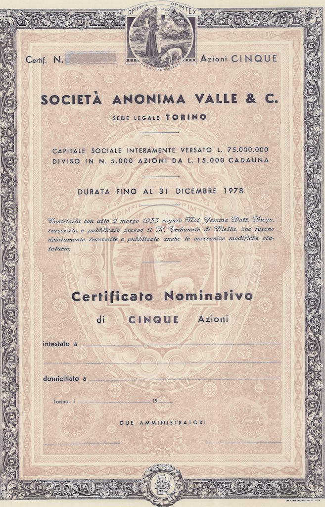 K-2743Valle & C. S.A.-11Off. Carte Valori Almasio & C. - IntraTorino195050 azioni nominative non emesse da Lire 15.000R2 (1001-5000 pezzi)S1 (da 0 a 25 €)