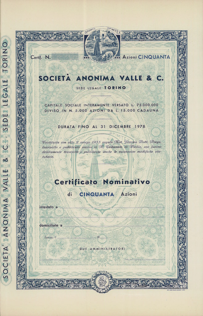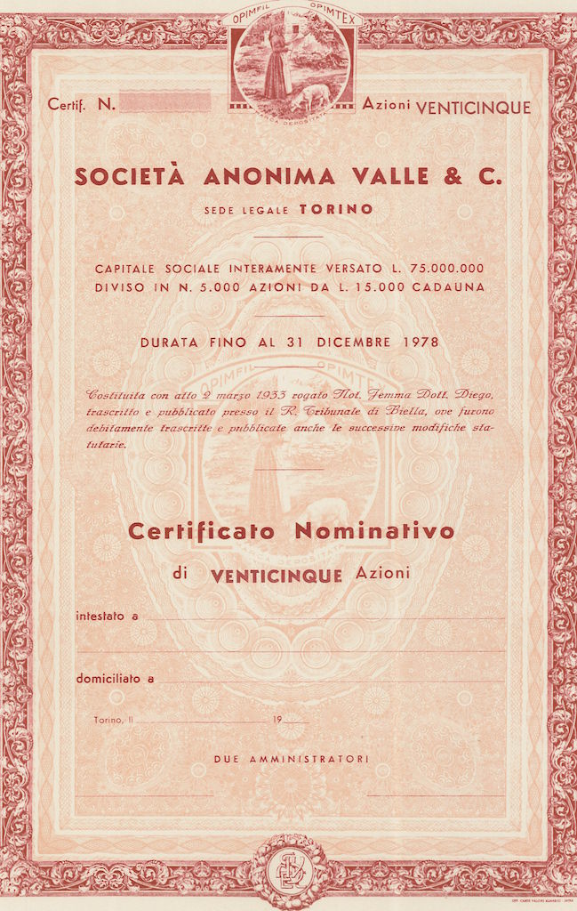 J-2743Valle & C. S.A.-10Off. Carte Valori Almasio & C. - IntraTorino195025 azioni nominative non emesse da Lire 15.000R2 (1001-5000 pezzi)S1 (da 0 a 25 €)