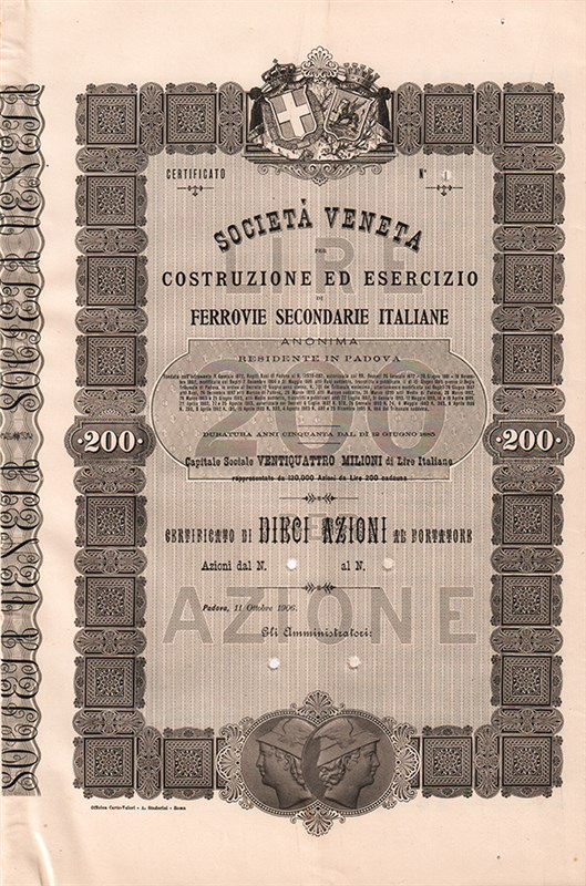 G-50743Veneta per Costruzione ed Esercizio di Ferrovie Secondarie Italiane S.A.-7Padova190610 azioni al portatore da 200 LireR2 (1001-5000 pezzi)S3 (da 51 a 100 €)