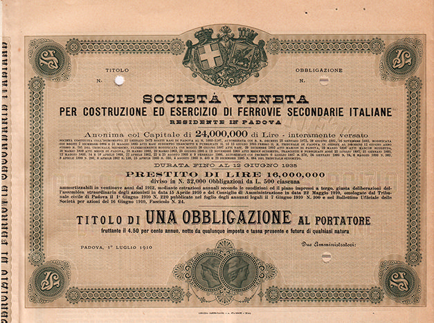 H-50743Veneta per Costruzione ed Esercizio di Ferrovie Secondarie Italiane S.A.-8Padova19101 obbligazione 4,5% al portatore da Lire 500R2 (1001-5000 pezzi)S3 (da 51 a 100 €)