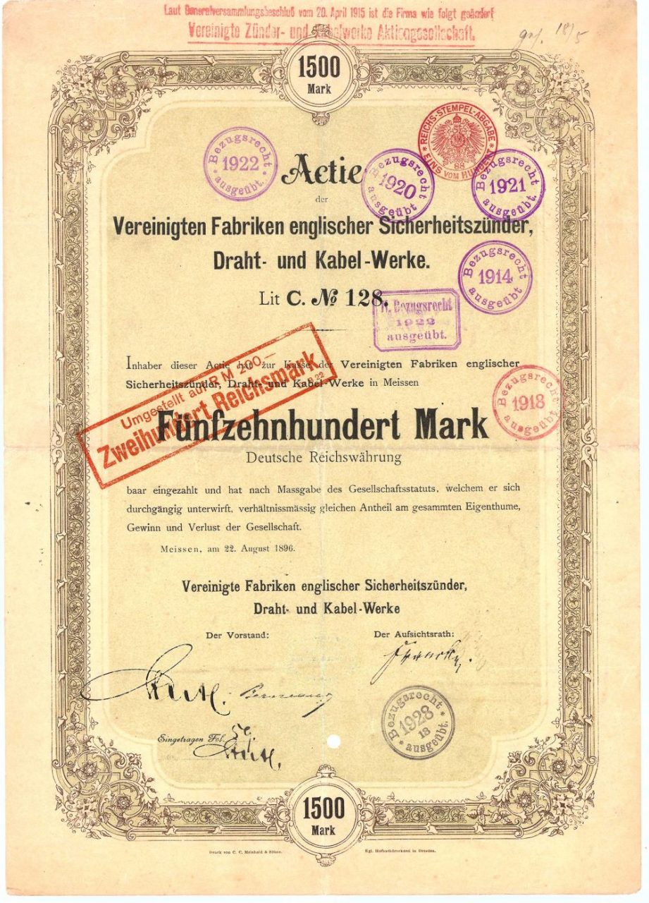 A-64794Vereinigte Fabriken englischer Sicherheitszünder, Draht-und Kabel-Werke-1Meissen18961 azione da 1.500 MarchiR4 (251-500 pezzi)S4 (da 101 a 250 €)