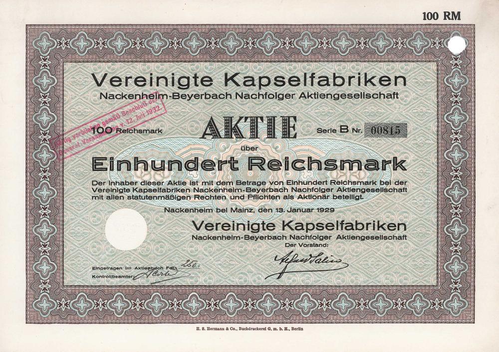 La fabbrica, costruita da Franz Frenay nel 1868, fu chiamata nel 1900 “Nackenheimer Metallkapseln & Kellereimaschinen-Fabrik AG”, fondata a questo scopo. Nel 1913 cambio di nome come sopra quando rileva la fabbrica di capsule Beyerbach Nachf. A Hattersheim. Vengono prodotte capsule metalliche per bottiglie di vino e champagne e altri oggetti metallici, nonché macchine da cantina di ogni genere. Nel 1956 convertita in una GmbH, ancora oggi leader di mercato in Germania per capsule metalliche.