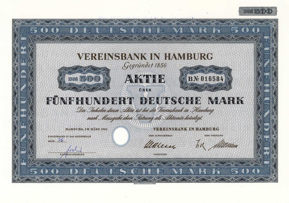 A-65498Vereinsbank in Hamburg-1Amburgo19611 azione da 500 MarchiR3 (501-1000 pezzi)S3 (da 51 a 100 €)