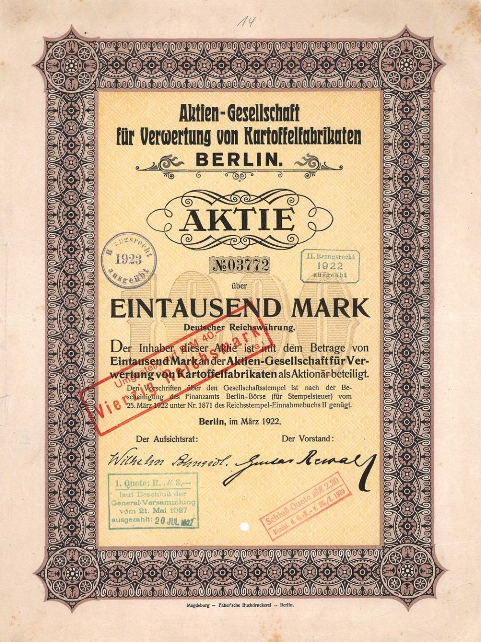 Fondata nel 1912 per rilevare e proseguire le attività commerciali della “Verwertungsstelle für Kartoffelfabrikate mbH” di Berlino e delle “fabbriche per i marchi di patate Frankfurt a.O. e Wronke GmbH i.L. ”. Produzione e riciclo di farina di patate, amido, sciroppo, zucchero candito, destrina e altri prodotti a base di patate. Le fabbriche più recenti a Francoforte sul Meno, Zörbig e Rosenig, mentre le fabbriche di Wronke, Bronislaw e Birnbaum dovevano essere cedute a una AG polacca di recente fondazione a seguito della prima guerra mondiale nel 1919/20. Elencata a Berlino dal 1921. Finita in liquidazione alla fine del 1925 dopo notevoli perdite.