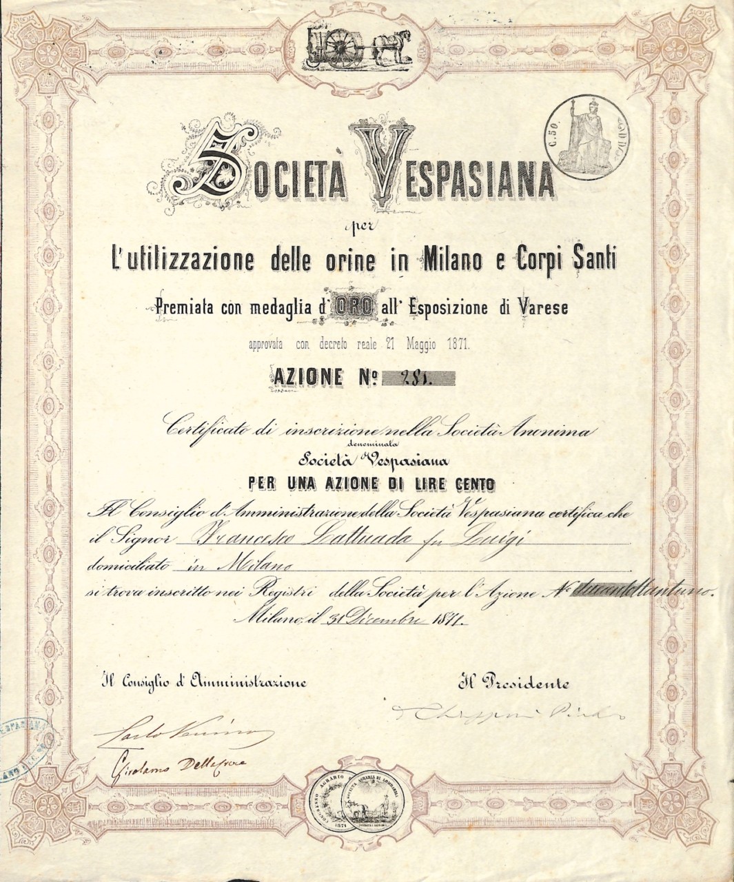 A-7969Vespasiana per l’Utilizz. delle Orine in Milano e Corpi Santi Soc.-1N.D.Milano18711 azione di fondazione nominativa da Lire 100R9 (6-10 pezzi)S5 (da 251 a 500 €)
