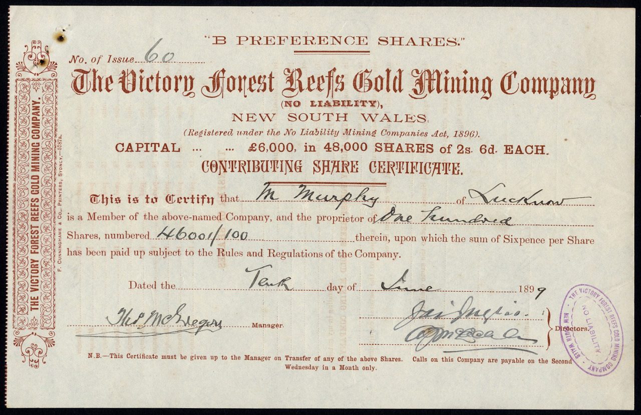 A-33352Victory Forest Reefs Gold Mining Company NL-1Nuovo Galles del Sud1899contributing sharesR2 (1001-5000 pezzi)S2 (da 26 a 50 €)
