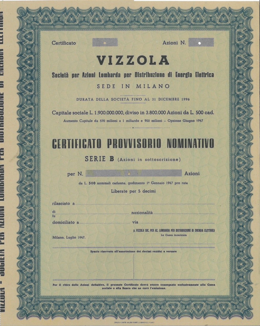 B-13702Vizzola S.p.A.-2Officina Carte Valori Turati Lombardi e C. - MilanoMilano19471 azione provvisoria nominativa da Lire 500R2 (1001-5000 pezzi)S1 (da 0 a 25 €)