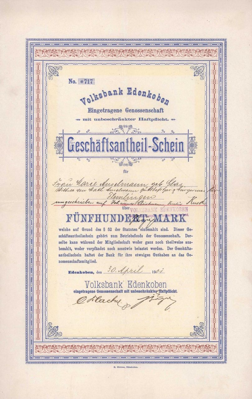 Nel 1865, 35 commercianti, artigiani e commercianti fondarono un’associazione di pagamento anticipato nella fabbrica di birra bavarese di Edenkoben per coprire reciprocamente le esigenze di prestito. Nel 1901 fu creata la Volksbank Edenkoben eGmuH. Dopo diverse fusioni abituali alla fine del XX secolo, nel 2002 è stata infine incorporata nella VR Bank Südpfalz (48.200 membri, quasi 500 dipendenti e 40 filiali nei distretti di Germersheim e Südliche Weinstrasse, nonché nelle città di Landau e Neustadt).