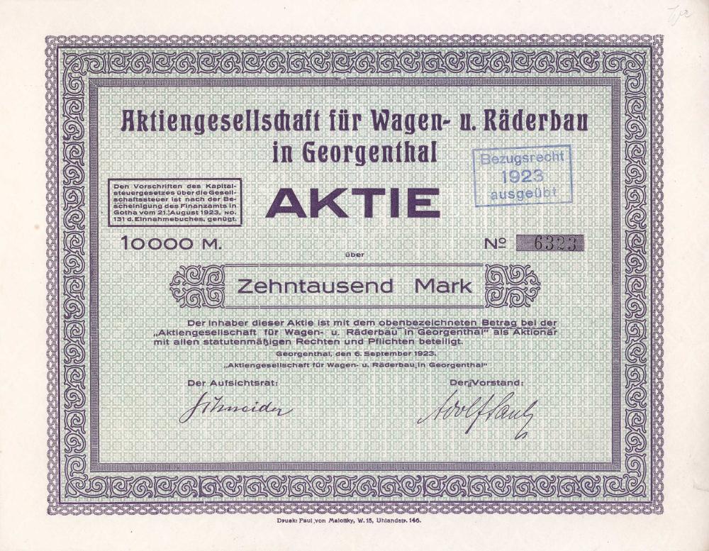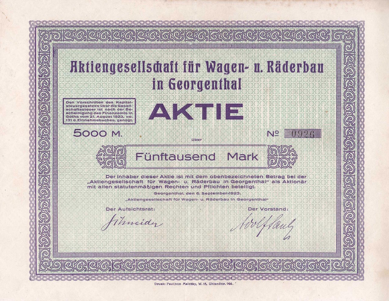 Fondazione in agosto / sett. 1923 per l’acquisizione e la continuazione del martello per acqua e vapore che lavora con la torneria di ferro e la fabbrica di assi da Florence Saul a Georgenthal vicino a Gotha, che esisteva dal 1875. Vennero prodotti carri, ruote di ferro e di legno, nonché altri dispositivi e macchine, in particolare quelli necessari per l’agricoltura. Nel 1925 andò in liquidazione.