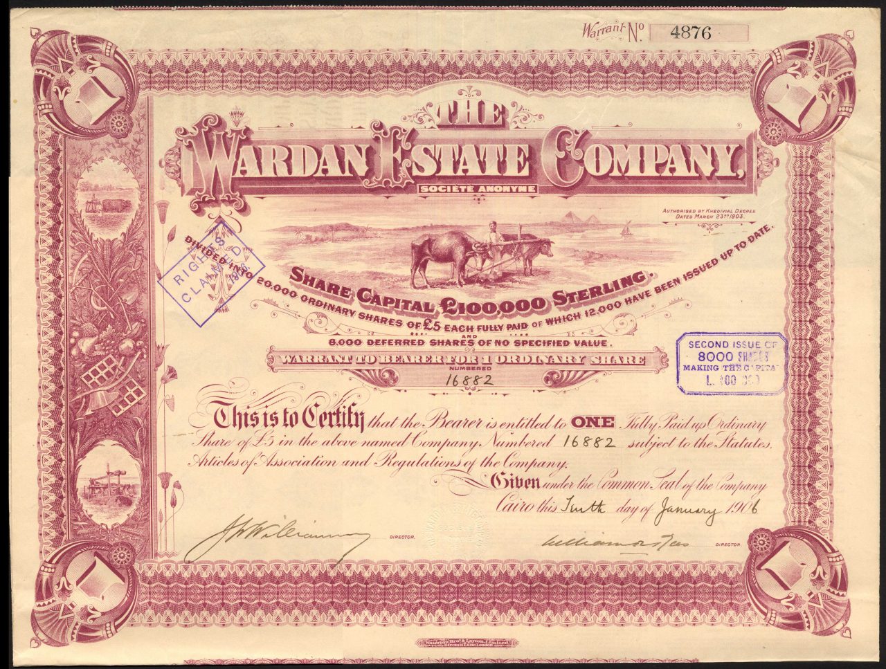 Capitale £ 100.000 in 20.000 azioni ordinarie di £ 5 e 6.000 azioni differite. Successivamente è aumentato a £ 150.000 in 30.000 azioni ordinarie e 8.000 azioni differite.