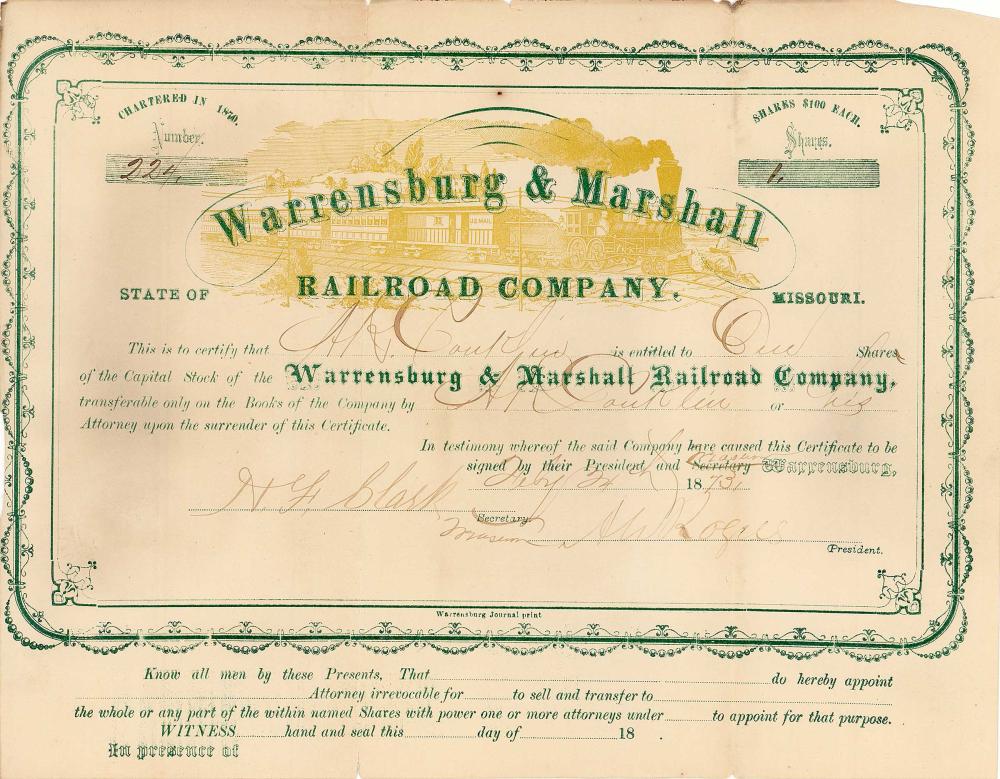Nel 1864 Warrensburg era la fine della linea ferroviaria Missouri Pacific RR da est. La Warrensburg & Marshall RR è stata fondata nel 1870. Ha avuto origine in un periodo di "epidemie di progetti ferroviari". Il treno era previsto da Warrensburg a Marshall nella contea di Saline. Nel 1870 la contea di Johnson offrì $ 100.000 per la costruzione della ferrovia. Il percorso è stato misurato e doveva correre per 13 miglia a nord-est di Warrensburg. Ma non c'erano abbastanza soldi per costruire e la ferrovia fallì.