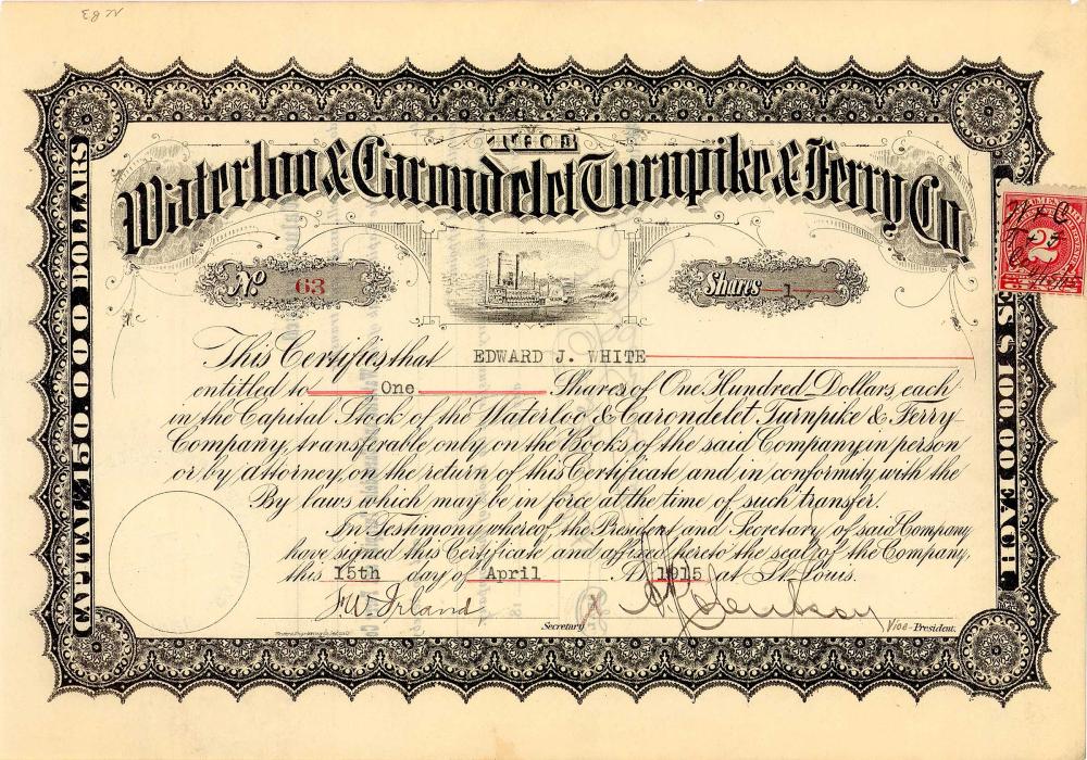 Un’azienda molto interessante fondata nel 1855. Carrozze e pedoni arrivavano dalla stazione ferroviaria del Missouri Pacific a St. Louis a un molo dei traghetti per il quale era stata affittata dalla città una proprietà di 200 piedi sul fiume Mississippi alla fine di Davis St. a Carondelet nel sud-ovest di St. Louis. Da lì si prendeva un traghetto per la riva orientale del fiume Mississippi, di cui si occupava la Davis Street Ferry Road. È stata costruita da questa azienda come strada a pedaggio. Ha portato i viaggiatori ai terminal ferroviari che terminavano sulla sponda orientale del fiume. Non ci fu altro modo per quasi 20 anni: fu solo nel 1874 che fu aperto l’Eads Bridge, il primo ponte sul fiume Mississippi a sud della confluenza del fiume Missouri.