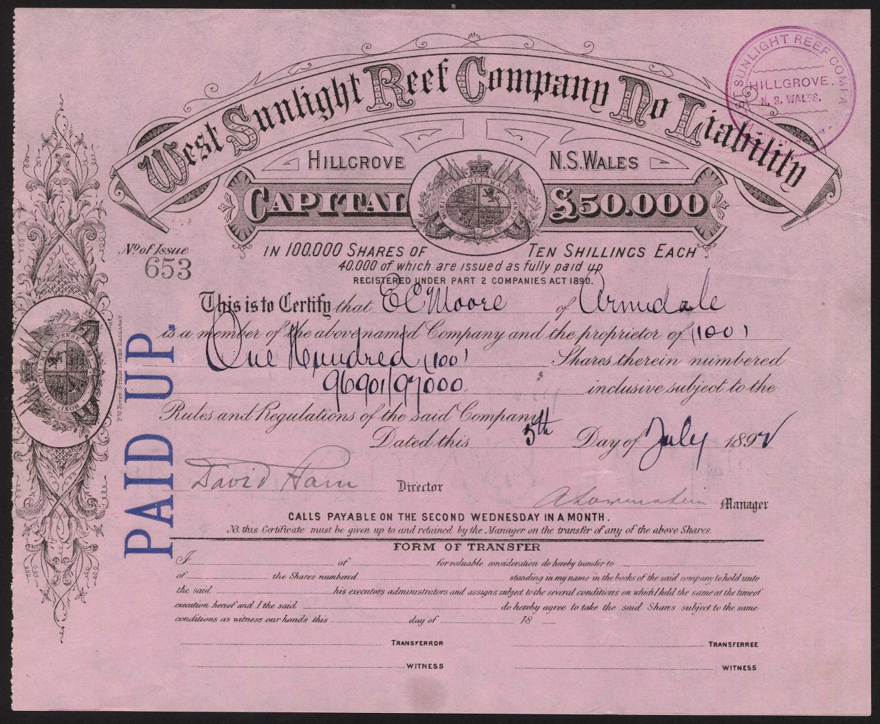 Registrato a Victoria ai sensi del 1890 Companies Act, nel 1892 circa. Miniere a Hillgrove, Nuovo Galles del Sud.