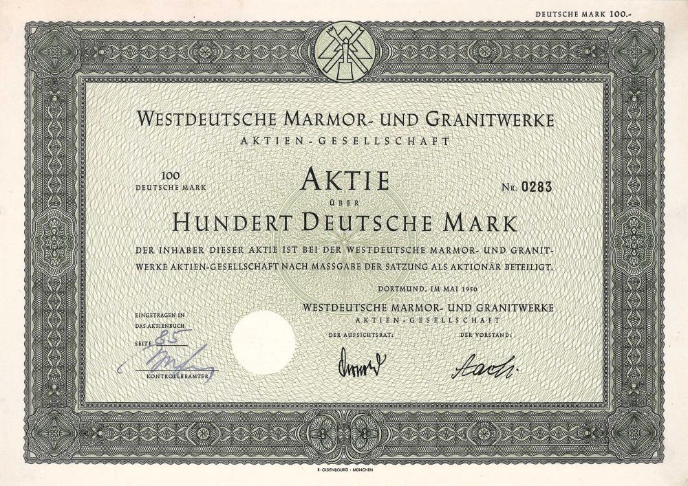 A-65528Westdeutsche Marmor-und Granitwerke-1Dortmund19501 azione da 100 MarchiR2 (1001-5000 pezzi)S2 (da 26 a 50 €)