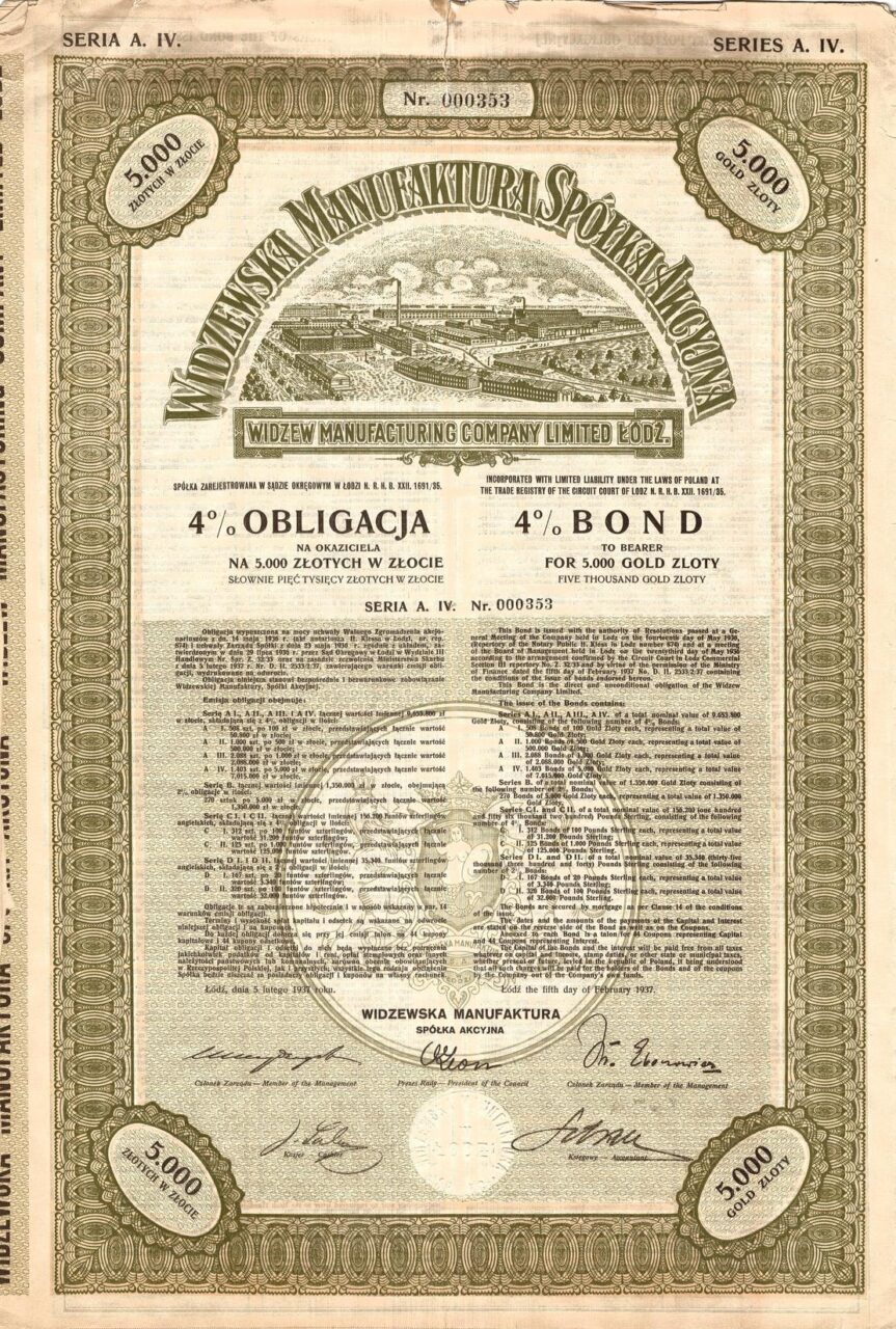 Fondata da una ricca famiglia ebrea di origine tedesca che già possedeva vari altri opifici in Polonia. Sullo sfondo e a tergo della cartella imponente medaglione che racchiude il marchio dell’azienda.