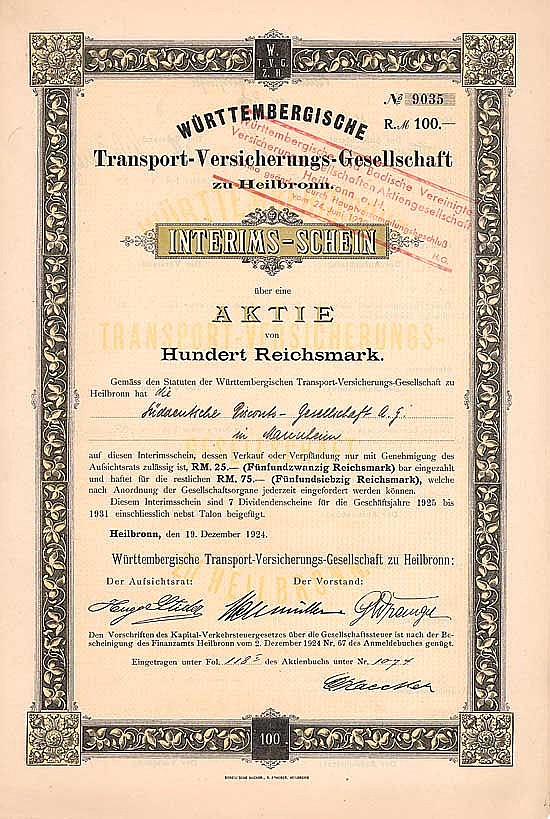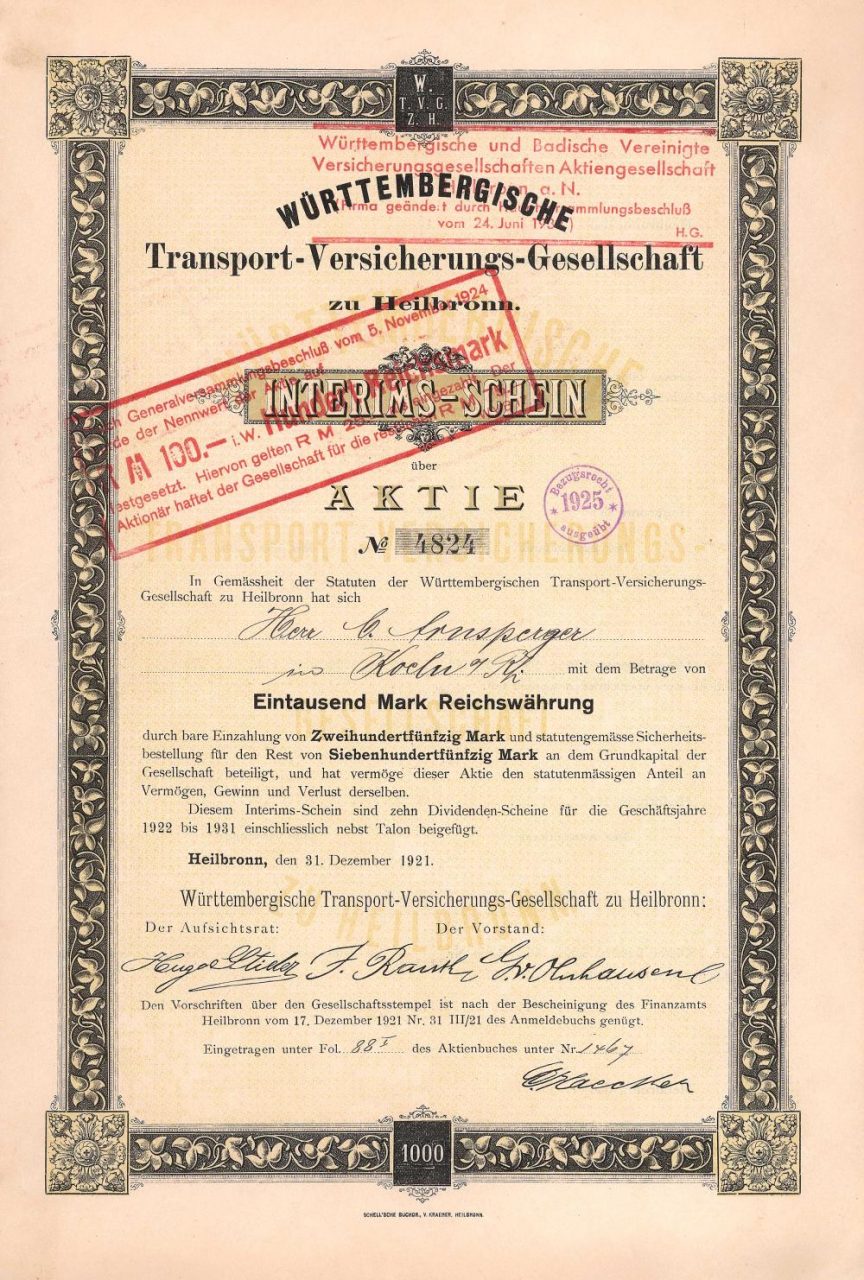 Fondata nel 1837 come "Württembergische Schiffahrts-Assecuranz". Nel 1939 fusione con "Badische Assecuranz-Gesellschaft AG" e "Schiffahrts-Assecuranz-Gesellschaft AG" a Mannheim a "Württembergische und Badische Vereinigte Versicherungsunternehmen AG". Nel 1972 cambiò il nome in "Württembergische und Badische Versicherungsgesellschaft AG". Nel 1994 acquisizione dell'attività assicurativa di Elektra Versicherungs-AG a Francoforte sul Meno, nel 1998 acquisizione del portafoglio assicurativo di Nord-Deutsche Versicherungs-AG ad Amburgo. Precedentemente elencato a Mannheim, quindi elencato a Stoccarda e Francoforte. Fino al 2004, Wüstenrot & Württembergische AG deteneva oltre il 98% delle azioni di Stoccarda (in parte tramite Württembergische Lebensversicheru... Altro