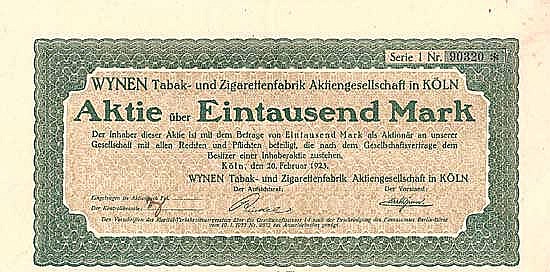 Fondata nel 1922 come “John Küttner Tabak-und Zigarettenfabrik AG” a Berlino, nel 1923 trasferimento a Colonia e rinominata come sopra. Produzione e vendita di sigarette e prodotti a base di tabacco, in particolare il marchio noto nel commercio come sigarette Wynen-Virginia. Nel 1927 l’azienda fu ribattezzata “Kölner Cigarettenfabrik AG”. Soppressa d’ufficio nel settembre 1929.