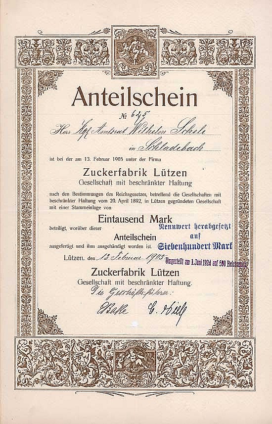 A-68653Zuckerfabrik Lützen GmbH-1Lützen19051 azione da 1.000 Marchi--