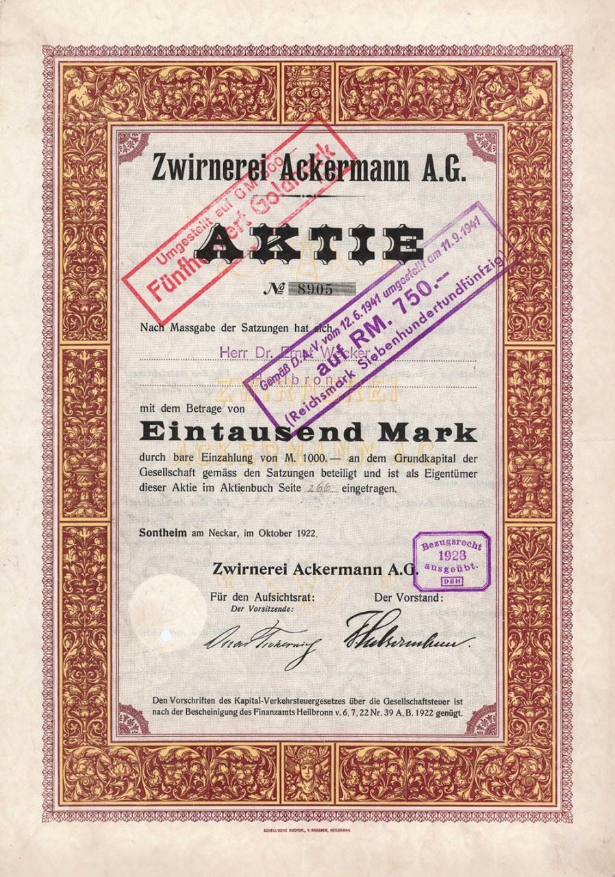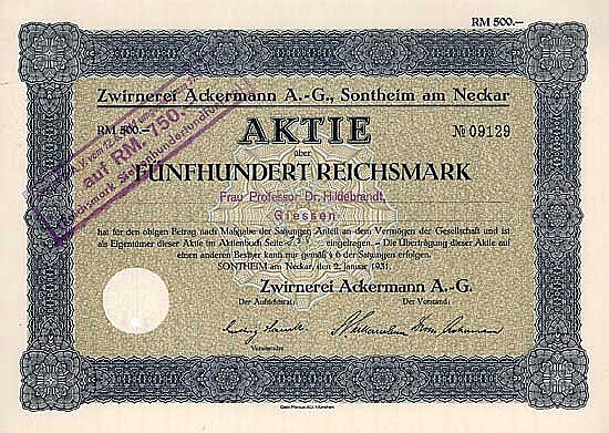 Fondata nel 1882 come “Mechanical Zwirnerei Heilbronn vorm. C. Ackermann & Cie. ”, Ribattezzata nel 1919 come sopra. Operazione di un twister di cotone, anche produzione di fili per cucire, uncinetto e rammendo. Nel 1957 fusione con la fabbrica di filo per cucire a Göggingen per formare la Ackermann-Göggingen AG con sede ad Augusta. Nel 1994, dopo che la maggioranza delle azioni è stata rilevata dal gruppo di servizi Wisser (che era principalmente interessato alla proprietà), l’attività operativa è stata venduta al concorrente Amann & Söhne GmbH & Co. KG a Bönnigheim. La stessa AG è stata ribattezzata Anterra AG ed esiste ancora oggi come società di gestione patrimoniale quotata.